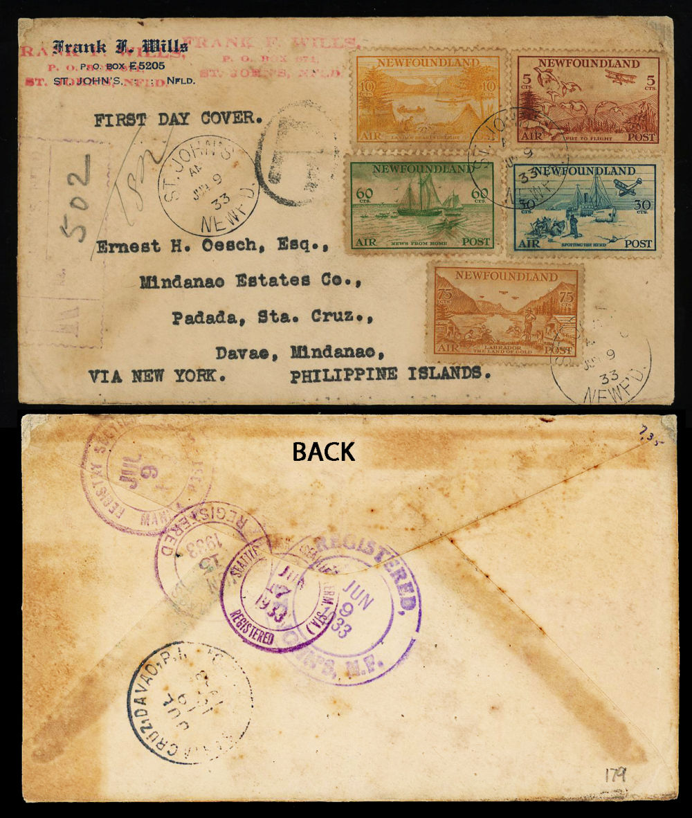 179 image1933 NEWFOUNDLAND REGISTERED FDC to PHILIPPINES, incredible Labrador Issue franking #C13-C17 posted at ST-JOHN'S on the first day of issue B259JUN-9-1933 and addressed to DAVAE-PHILIPPINES, routed via BOSTON on JUN-15 + SEATTLE on JUN-17 + ship to MANILA on JUL-9 + DAVAE arrival on JUL-19, a 40 day trip with a small cover trim RHS and corner wear neatly restored, a FDC rarity to a great destination, retails at least $300 US ($500 CDN), F-VF est ($300+ US) (Image)