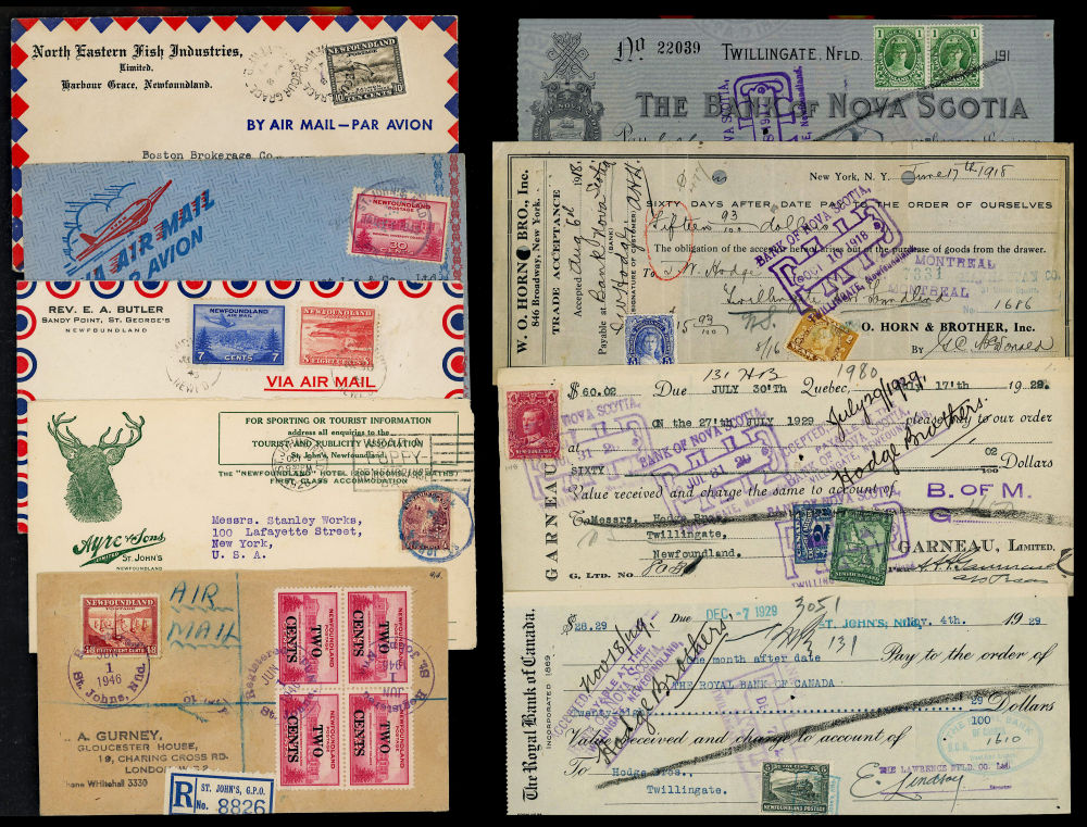 180 image12 NEWFOUNDLAND COVERS & CHEQUES 1917-1945, includes better 1926 Ayre Grocers & Hardware advertising cover with 4¢ AYRE perfin franking to USA, another Ayre 30¢ airmail rate with an AYRE perfin franking, 1946 registered 64¢ rate to England, 1946 registered OHMS airmail 15¢ rate to USA, 1945 airmail 15¢ USA rate ++, retails over $230 US ($325 CDN), F-VF est (Image)