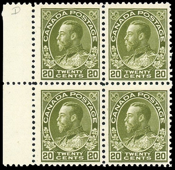 Olive Green, a post office fresh mint block of four, sheet margin at left, lovely colour, blocks of this printed are scarce, F-VF NH (Image1)
