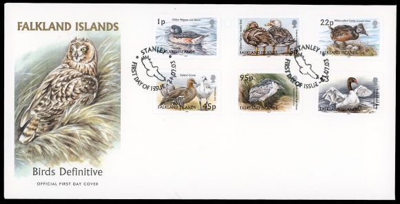 2461   imageFALKLAND ISLANDS FDC'S 1990 - 2003 - A hundred first day covers, all cacheted and unaddressed, we note 1994 marine life, 2003 birds, etc., a lovely lot with good degree of completion, nicely mounted on album pages with page protectors, VF (Image1)