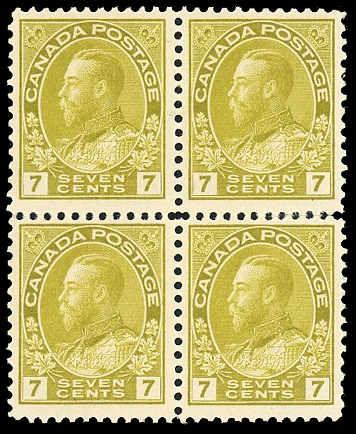 Greenish Yellow, a very scarce mint block of four of this elusive shade, minor perf separation, the lower left stamp is NH, a desirable block with bright vivid colour, F-VF LH