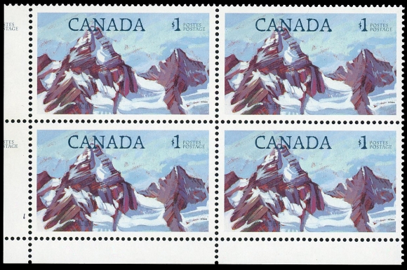 Glacier lower left corner block showing a drastic shift of the blue engraved inscriptions, the denomination appears at the right as a result and part of the inscription from two other stamps can be seen in the left margin, a great block, VF NH (Image1)