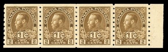 Brown coil, the scarce die I in an unused strip of four with end of roll tab at right, VF NG (Image1)