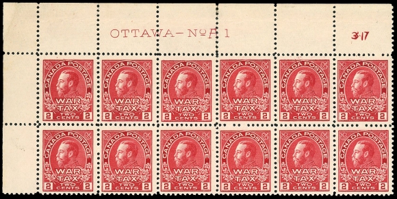 Carmine plate A1 upper left block of twelve mint, light crease and hinged in margin only, all stamps are NH, fresh and well centered with bright colour, VF