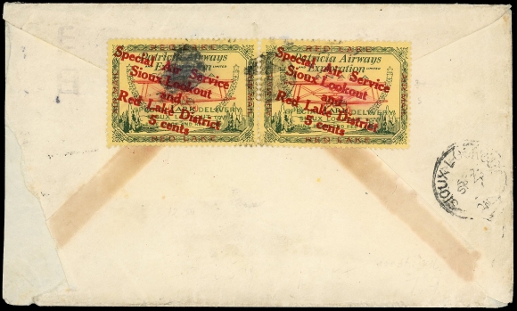 AIRWAYS FLIGHT COVER - #CL15c, 5¢ Pair with type B ascending overprint in red on Sept. 2, 1927 cover from Sault Ste. Marie to Pine Ridge, VF (Image1)
