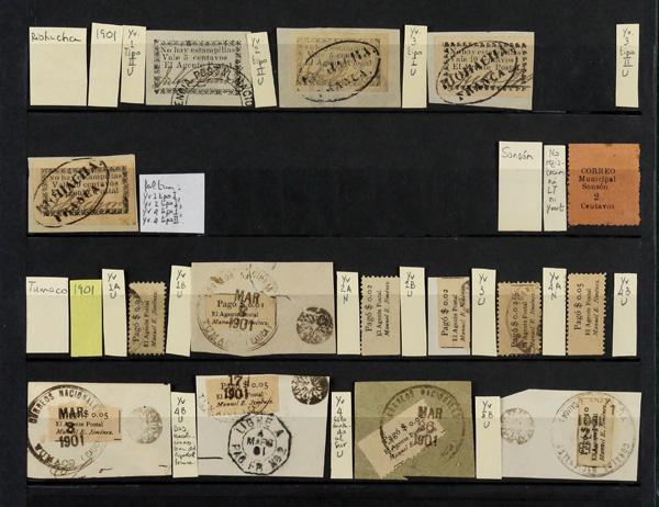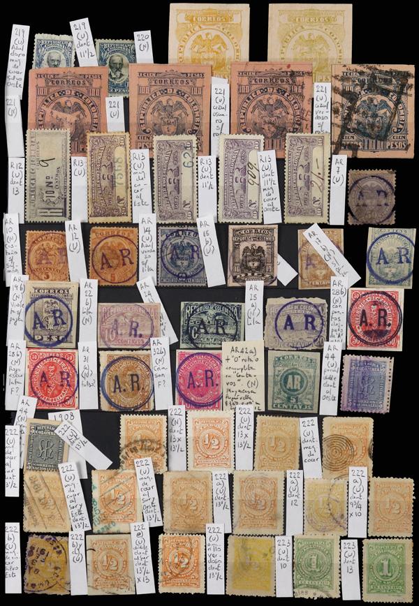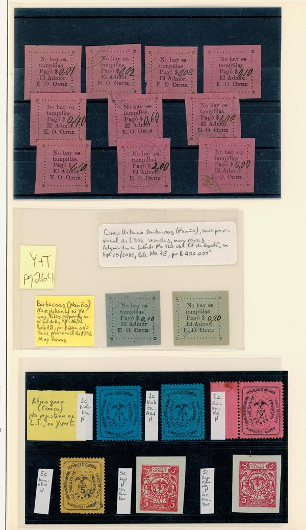 Colombia, Cities Group of Barbacoas & Cauca, consisting of vare rare city of Barbacoas in Nariño 10c (mint) & 20c (used) on green paper and 1c, 2c, 5c, 10c, 40c, 60c, 1p, 1.1p, 2p & 5p on maroon paper (used), 10c green & 60c maroon tiny faults invisible on face, and city of Cauca (6 mint singles and 4 large 5c & 10c imperforate mint multiples), Very Fine to Extremely Fine, fully imaged online. (Image)