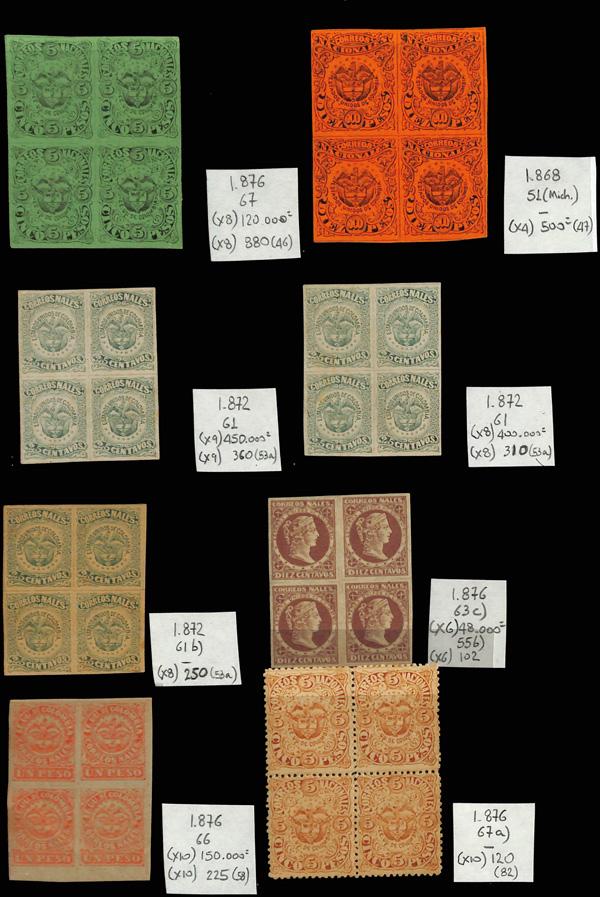 Colombia, Regular & Commemorative Issue Mint Blocks and Sheets with 2012 Temprano Certificates, 1870-1981, virtually all 1870/1944 issues in blocks of four including Scott Nos. 64, 65, 84, 89 (3), 211ab, 405 (2), 439 (2 with one split into pairs), 447, 484, 603 (2), and 665 (4), plus sheets of Scott Nos. 66, 67 & 846 (2) and an imperforate pair of Scott No. 702, a few back of book blocks including No. RA30, also includes No. CF1 used pair with horizontal misperf and violet Type I overprint, vast majority of the stamps are Never Hinged, couple blocks with small faults, Fine to Very Fine, fully imaged online, signed Temprano, usually at bottom left, virtually all with 2012 Temprano certificates regarding authenticity only. Shipping charges apply - weight 2.4 lbs. Scott approximately $5,200 +, as singles. (PDF2 for this Lot) (PDF3 for this Lot) (Image)