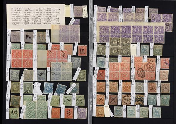 Colombia, Telegraph Issues Collection, 1881-1905, of over 750 stamps, mixed mint and used singles and blocks, many of the used with manuscript "X" cancels, beautifully organized on stockpages with each stamp having a small tab adjacent identifying the stamp by Temprano catalog number, generally Very Fine, fully imaged online. Shipping charges apply - weight 1 lbs. (Video for this lot) (Image)