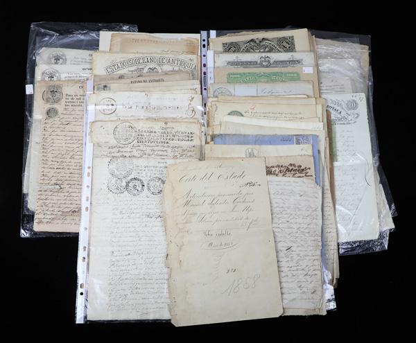 Colombia, Over 60 Documents, 1700's-1910's, including Confederation and Republic periods, begins with 7 from the 1700's, states including Antioquia (12), Boyaca (6), Cauca (2), Cundinamarca (1), many with a variety of revenue stamps including single and mixed frankings, also includes 13 Telegraphs 1890's-1910's; usual mixed condition, fully imaged online and well worth a look. Shipping charges apply - weight 1.8 lbs. A very seldom-seen group, especially the documents from the 1700's. (PDF for this Lot) (PDF2 for this Lot) (Image)