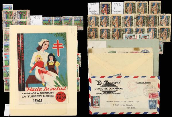 Colombia, Tuberculous Seals Collection, 1939-95, mixed mint and used mostly in large quantities with many varieties and covers interspersed, exceptionally well organized by year in 2 stockbooks, generally Fine to Very Fine, fully imaged online; how much will you cough up for the privilege of owning this wonderful collection? Shipping charges apply - weight 11 lbs. (PDF for this Lot) (Video for this lot) (Video2 for this lot) (Image)