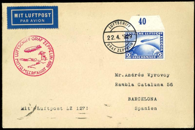 Mittelmeerfahrt 1929, Bordpost, Brief vom 22.4. mit 2 Reichsmark Zeppelin als Oberrandstück und allen Stempeln nach Barcelona, rückseitig Durchgansstempel SEVILLA, tadellose Erhaltung. (Image 1)(Image)
