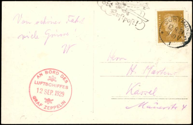 Germany tour 1929, part I, droped Dortmund, passenger post, card with machine cancel Dortmund 12.9. To Kassel, purple red on board confirmation mark 12.9, short Greeting "from beautiful trip. ", signature of the passenger, superb (33b)