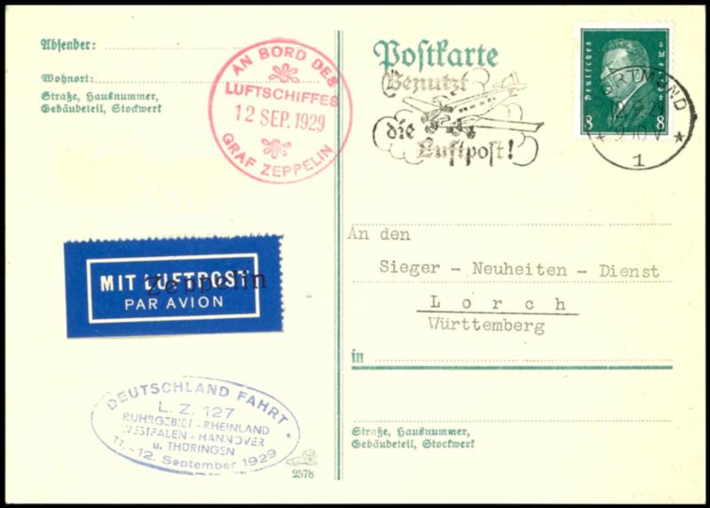 1929, 12.9 Deutschlandfahrt, Abwurf Dortmund, 8 Pfennig Ebert als Frankatur auf Zeppelinkarte mit Maschinenstempel "Dortmund 12 9 29 9-10V * * 1" und Werbeeinsatz "Benutzt die Luftpost", privater Ovalnebenstempel in blau, tadellos. (Image 1)(Image)
