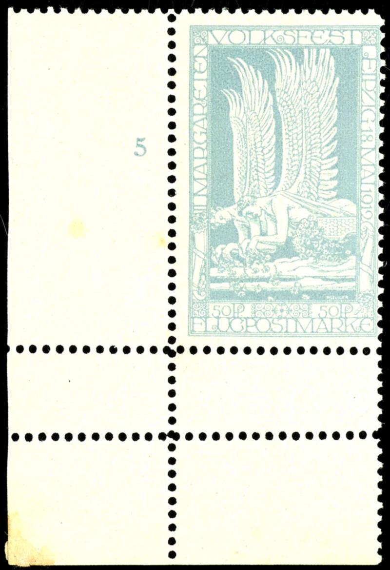 Margarethen poeple festival, mint never hinged 20 Pfg airmail stamp with plate flaw \S\ from festival with dot, left lower corner of the sheet, in the margin a few mould stain, attest Cornelia Brettl (4a) Certificate Margarethen Volksfest, postfrische 20 Pfg Flugmarke mit Plattenfehler \S\ von FEST mit Punkt, linke untere Bogenecke, im Rand einige Stockflecken, Befund Cornelia Brettl (Image)