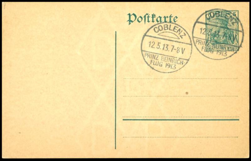 \COBLENZ Prince. HEINRICH flight 1913 12.5.13\, 2 x clear on 5 pfennigs postal stationery postcard unmailed without text. rare. \COBLENZ PRINZ.HEINRICH-FLUG 1913 12.5.13\, 2 x klar auf 5 Pfennig Ganzsachenkarte blanko ohne Text. Selten. (Image)