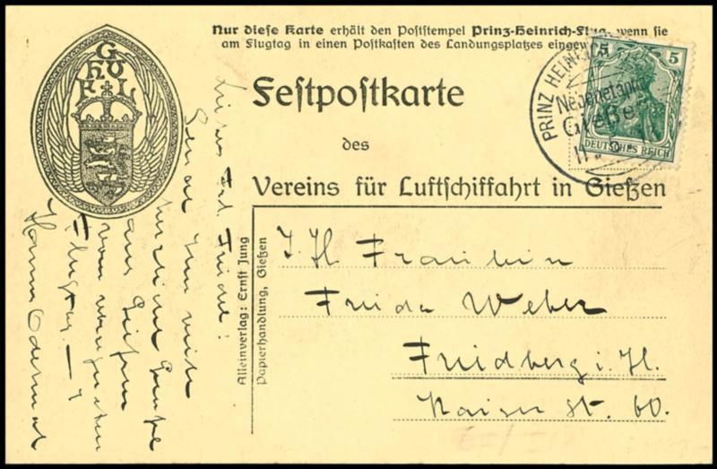 1913, preprinted celebration postcard to the PRINCE-HEINRICH-FLIGHT franked with 5 pfennigs Germania, cancelled by special cancel \Prince HEINRICH flight 1913 sub rear GIESSEN 11.5.13, addressed to Friedberg, reverse nice vignette, very fine, Michel Zeppelin catalogue 250.- (20/02) 1913, vorgedruckte Festpostkarte zum Prinz-Heinrich-Flug frankiert mit 5 Pfennig Germania, entwertet mit Sonderstempel \PRINZ HEINRICH FLUG 1913 NEBENETAPPE GIESSEN 11.5.13, adressiert nach Friedberg, rückseitig schöne Vignette, tadellose Erhaltung, Mi. Zeppelinkatalog 250.- (Image)