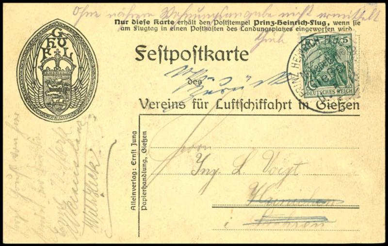 1913, preprinted celebration postcard to the PRINCE-HEINRICH-FLIGHT franked with 5 pfennigs Germania, cancelled by special cancel \Prince HEINRICH flight 1913 sub rear GIESSEN 11.5.13, addressed to Hainichen and return notation, very fine, Michel Zeppelin catalogue 250.- (20/02) 1913, vorgedruckte Festpostkarte zum Prinz-Heinrich-Flug frankiert mit 5 Pfennig Germania, entwertet mit Sonderstempel \PRINZ HEINRICH FLUG 1913 NEBENETAPPE GIESSEN 11.5.13, adressiert nach Hainichen und Zurück Vermerk, tadellose Erhaltung, Mi. Zeppelinkatalog 250.- (Image)