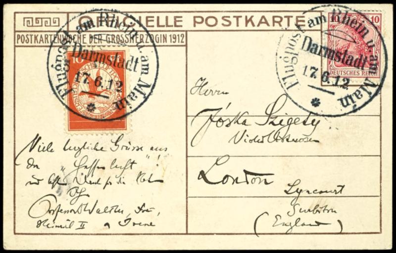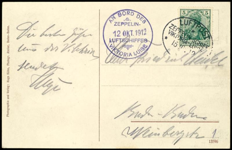 Viktoria Louisa 1912, special excursion at the 15.10, organizes from committee the National Flight contribution Frankfurt - Wiesbaden - Frankfurt, scarce picture postcard \view from the passenger Cabin on Frankfurt\ without use of the for these special event planned airmail special postal stationery card, with flight stamp 15.10. of the airship and on both sides violet on-board confirmation mark 12.10. to Baden Baden with 5 Pfg Germania, short greeting text and signature of the passenger, very unusual variety, superb (winner 4 (a) / 16 Ac) (4(a)/16Ac) Viktoria Luise 1912, Sonderfahrt am 15.10., organisiert vom Ausschuss der nationalen Flugspende Frankfurt - Wiesbaden - Frankfurt, seltene Bildkarte \Blick aus der Passagier-Kabine auf Frankfurt\ ohne Verwendung der für diese Sonderveranstaltung vorgesehenen Luftpost-Sonder-GSK, mit Flugstempel 15.10. des Luftschiffes und beidseitig violettem Bordstempel 12.10. nach Baden Baden mit 5 Pfg Germania, kurzer Grußtext und Signatur des Passagiers, sehr ungewöhnliche Variante, Pracht (Sieger 4(a)/16Ac) (Image)