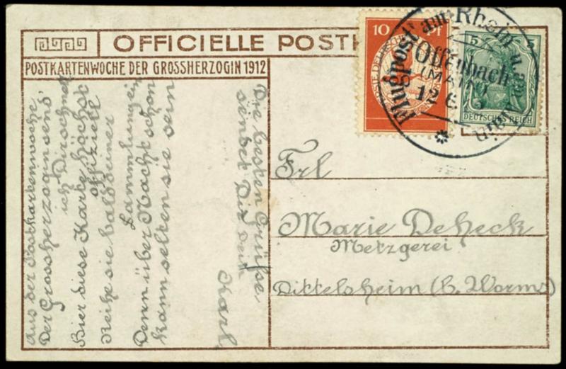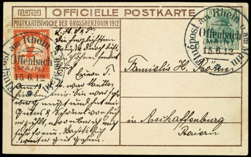 10 Pfg airmail stamp and 5 Pfg Germania on official photo postcard \Grand Duchess\ with flight special cancel Offenbach 12.6. to Dittelsheim by Worms, much text, superb (10) 10 Pfg Flugmarke und 5 Pfg Germania auf offizieller Fotokarte \Großherzogin\ mit Flug-SST Offenbach 12.6. nach Dittelsheim bei Worms, viel Text, Pracht (Image)