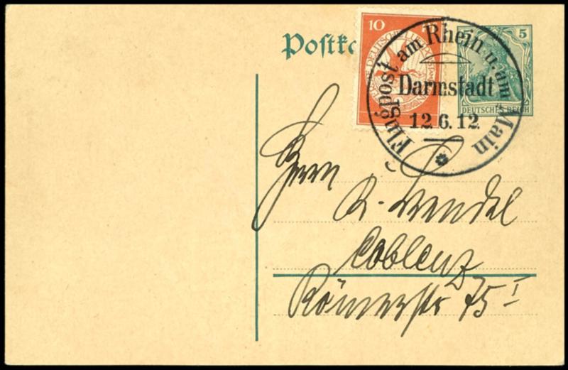 10 Pfg airmail stamp, very well-centered, in rare use on Germania postal stationery card 5 Pfg, perfect clear with flight special cancel Darmstadt 12.6. to Coblenz, reverse greeting text, superb (10) 10 Pfg Flugmarke, sehr gut zentriert, in seltener Verwendung auf Germania-GSK 5 Pfg, ideal klar mit Flug-SST Darmstadt 12.6. nach Koblenz, rs. Grußtext, Pracht (Image)