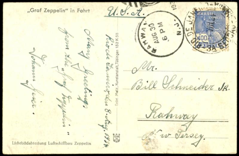 1934, 5. South America flight, photo postcard written from crew member Johann Vulture at the 8.8.34 in Rio de Janeiro addressed with ship mail to Rahway, NJ / USA, unusual 1934, 5. Südamerikafahrt, Fotokarte geschrieben vom Besatzungsmitglied Johann Geier am 8.8.34 in Rio de Janeiro adressiert mit Schiffspost nach Rahway, NJ / USA, ungewöhnlich (Image)