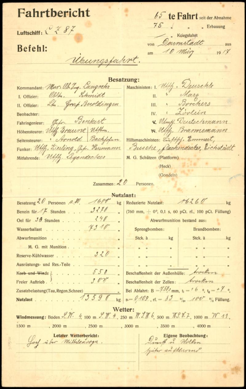 Army air ship LZ 87, shipyard number LZ 57, Trip report from 10.3.1917, very interesting document of the military air ship of a practice drive\. to the education the crew\ from Darmstadt over Griesheim and Worms return to Darmstadt under the command from March engineer Langrehr, form with all technical data of the airship and many further details, burden, factory supplies, names the crew, weather situation, course of the trip and further indicated, car reviews military air ships are allways very rare (LZ87) Heeresluftschiff LZ 87, Werftnummer LZ 57, Fahrtbericht vom 10.3.1917, hochinteressantes Dokument des militärischen Luftschiffes von einer Übungsfahrt \... zur Ausbildung der Besatzung\ ab Darmstadt über Griesheim und Worms zurück nach Darmstadt unter dem Kommando von Mar.-Ing. Langrehr, Formblatt mit allen technischen Daten des Luftschiffes und vielen weiteren Details, Ballast, Betriebsstoffe, Namen der Besatzung, Wetterlage, Fahrtverlauf und weiteren Angaben, Fahrtberichte militärischer Luftschiffe sind durchweg sehr selten (Image)