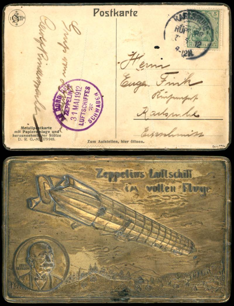 Swabia 1912, transfer trip Frankfurt - Oos 31.5, droped Karlsruhe Rueppur, extreme scarce, contemporary used brass sheet metal card \ZEPPELIN airship in the full flights\ with 5 Pfg Germania and date stamp Karlsruhe Rueppur 31.5 with alongside very clear blue violet on-board confirmation mark 31.5, short \Greeting from Zeppelin . \ and signature of the passenger, these metal installation cards are in contemporary use only in very few copies known, excellent condition, signature Buehler (2I) Schwaben 1912, Überführungsfahrt Frankfurt - Oos 31.5., Abwurf Karlsruhe Rüppur, äußerst seltene, zeitgenössisch verwendete Messingblech-Karte \Zeppelins Luftschiff im vollen Fluge\ mit 5 Pfg Germania und Tagesstempel Karlsruhe Rüppur 31.5 mit nebengesetzt sehr klarem blauviolettem Bordstempel 31.5., kurzer \Gruß vom Zeppelin ...\ und Signatur des Passagiers, diese Metall-Aufstellkarten sind in zeitgenössischer Verwendung nur in ganz wenigen Exemplaren bekannt, sehr gute Erhaltung, Signatur Bühler (Image)