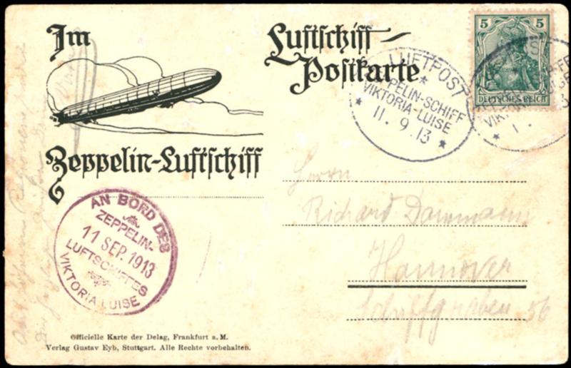 Viktoria Louisa 1913, circuit from and to Frankfurt 11.9, Delag picture postcard \Bad Nauheim\ with 5 Pfg to Hanover, flight stamp 11.9. and alongside violet on-board confirmation mark 11.9, small patina, short greeting text and signature of the passenger (4) Viktoria Luise 1913, Rundfahrt ab und bis Frankfurt 11.9., Delag Bildkarte \Bad Nauheim\ mit 5 Pfg nach Hannover, Flugstempel 11.9. und nebengesetzt violetter Bordstempel 11.9., geringe Patina, kurzer Grußtext und Signatur des Passagiers (Image)