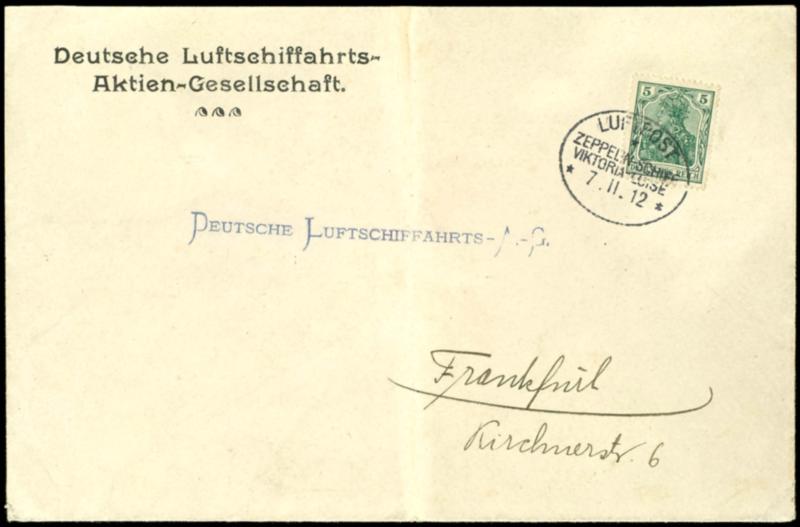Viktoria Louisa 1912, special excursion at the 7.11. organizes from committee the National Flight contribution Frankfurt - Wiesbaden - Frankfurt, printed form-envelope \German airship aviation AG\ in rare use instead of the for these special event planned airmail special postal stationery card with flight stamp 7.11, vertical crease in the middle, addressed to the\. airship aviation AG\ in Frankfurt with 5 Pfg Germania as local letter postage, the post was that day not over Wiesbaden droped, there no post office clerk present was, and again return to Frankfurt and on regular way to the goal transported, very unusual variety, ex Kofler (winner 4 / 16 Ac) (4/16Ac) Viktoria Luise 1912, Sonderfahrt am 7.11. organisiert vom Ausschuss der nationalen Flugspende Frankfurt - Wiesbaden - Frankfurt, Vordruck-Umschlag \Deutsche Luftschiffahrts-AG\ in seltener Verwendung statt der für diese Sonderveranstaltung vorgesehenen Luftpost-Sonder-GSK mit Flugstempel 7.11., senkrechter Mittelbug, adressiert an die \... Luftschiffahrts-AG\ in Frankfurt mit 5 Pfg Germania als Ortsbriefporto, die Post wurde an diesem Tag nicht über Wiesbaden abgeworfen, da kein Postbeamter zugegen war, und wieder zurück nach Frankfurt und auf regulärem Weg zum Ziel befördert, sehr ungewöhnliche Variante, ex Kofler (Sieger 4/16Ac) (Image)