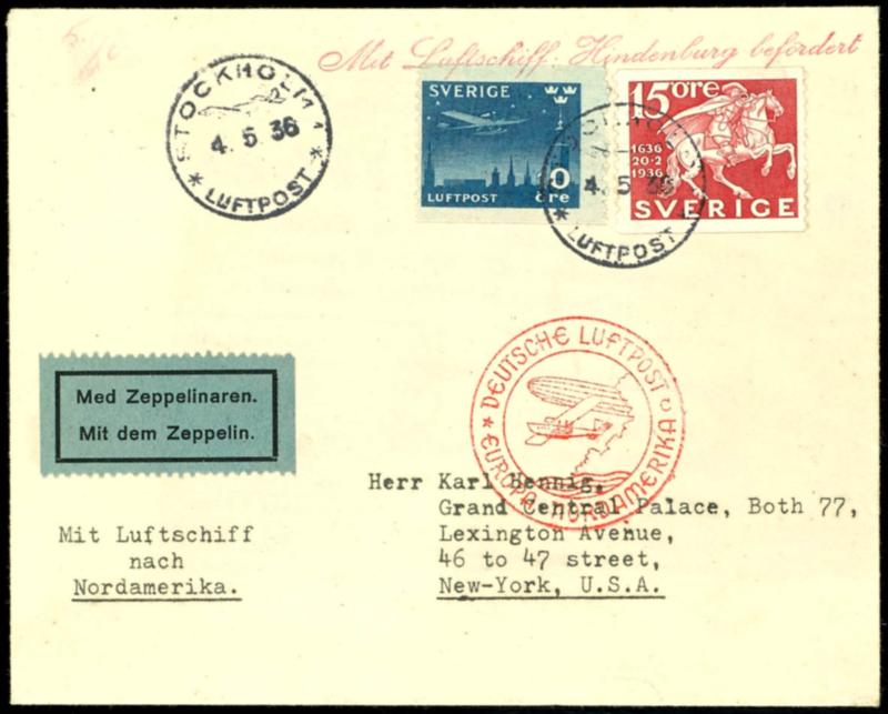 1936, 1. North America flight LZ 129, letter from Stockholm from 4.5.36 via Frankfurt to New York 9.5. (12) 1936, 1. Nordamerikafahrt LZ 129, Brief ab Stockholm vom 4.5.36 via Frankfurt nach New York 9.5. (Image)