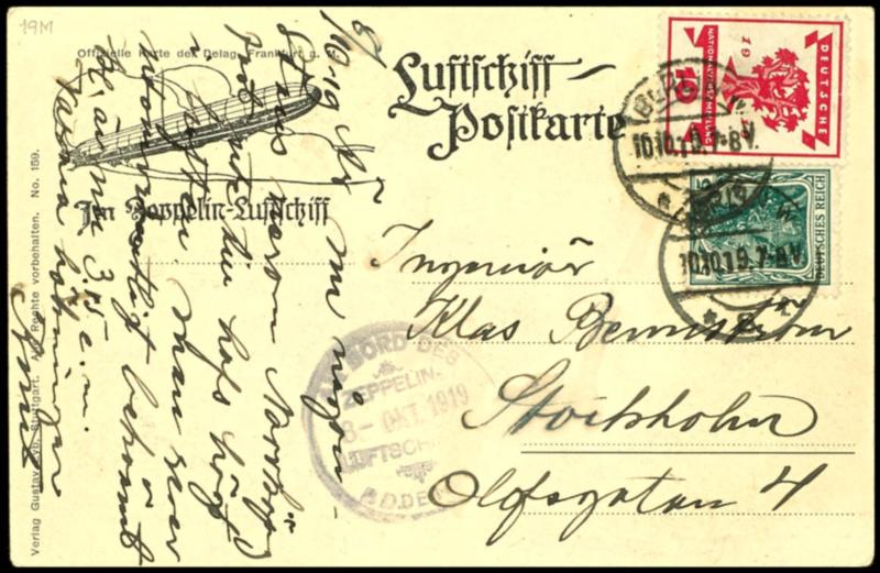1919, 8.10. Stockholm trip, return flight Stockholm - Friedrichshafen, Delag-picture card \in the Cabin of the Zeppelin air ship\, written from a swedish passenger to Stockholm with on-board confirmation mark the Lake Constance from 8.10, the properly franking from 10 Pfg National Assembly and 5 Pfg Germania was to arrival of the airship in Berlin at the 10.10.19 cancelled, expertized Aisslinger BPP (19M) 1919, 8.10. Stockholmfahrt, Rückfahrt Stockholm - Friedrichshafen, DELAG-Bildkarte \In der Kabine des Zeppelin Luftschiffes\, geschrieben von einem schwedischen Passagier nach Stockholm mit Bordstempel der Bodensee vom 8.10., die portogerechte Frankatur aus 10 Pfg Nationalversammlung und 5 Pfg Germania wurde nach Ankunft des Luftschiffes in Berlin am 10.10.19 entwertet, geprüft Aisslinger BPP (Image)