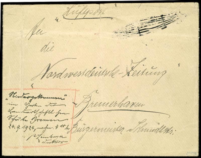 Z. R. 3 \lot Angeles\ 1924, North Germany trip, droped Bremen, passenger post, without prepaid postage dropped letter to Bremerhaven to the Editorship the Northwest German newspaper, obviously private cancel in Zeppelin form, finder notice\. in the gardens the agricultural school Bremen, 24.9.1924, in the afternoon 4: 10\ and signature of the Finders \. director\, folded and traces of usage, without further postal note, accordingly the newspaper per messenger direct brought, photo expertize H. W. winner (winner 020 i) (020i) Certificate Z.R. 3 \Los Angeles\ 1924, Norddeutschlandfahrt, Abwurf Bremen, Passagier-Post, unfrankiert abgeworfener Brief nach Bremerhaven an die Redaktion der Nordwestdeutschen Zeitung, augenscheinlich privater Stempel in Zeppelinform, Findervermerk \... im Garten der Landwirtschaftlichen Schule Bremen, 24.9.1924, nachm. 4:10\ und Signatur des Finders \... Direktor\, gefaltet und Bedarfsspuren, ohne weitere postalischen Vermerke, demnach der Zeitung per Boten direkt gebracht, Fotoattest H.W. Sieger (Sieger 020i) (Image)