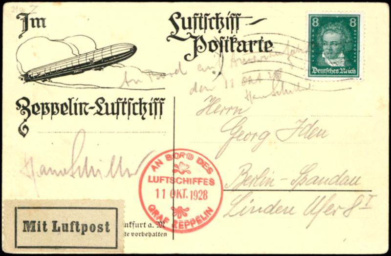 America flight 1928, droped Constance, board mail 11.10, post from crew members, Delag card \Bergedorf\ with 8 Pfg and machine cancel Constance 11.10, slight trace of crease, on face personal signature from captain Hans from Schiller with notation \aboard on America flight. \, expertized Aisslinger BPP (21a) Amerikafahrt 1928, Abwurf Konstanz, Bordpost 11.10., Post von Besatzungsmitgliedern, Delag Karte \Bergedorf\ mit 8 Pfg und Maschinenstempel Konstanz 11.10., leichte Bugspur, vs. eigenhändige Unterschrift von Kapitän Hans von Schiller mit Vermerk \An Bord auf Amerikafahrt ...\, geprüft Aisslinger BPP (Image)