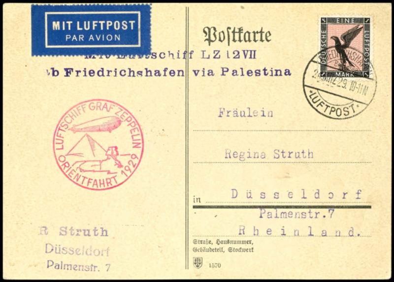 Orient trip 1929, photo postcard from Friedrichshafen 24.3. with 1 Mark airmail with corner margin top left, purple red flight stamp on face, superb (23IA) Orientfahrt 1929, Fotokarte ab Friedrichshafen 24.3. mit 1 Mark Flugpost mit Eckrand oben links, lilaroter Flugstempel vs., Pracht (Image)