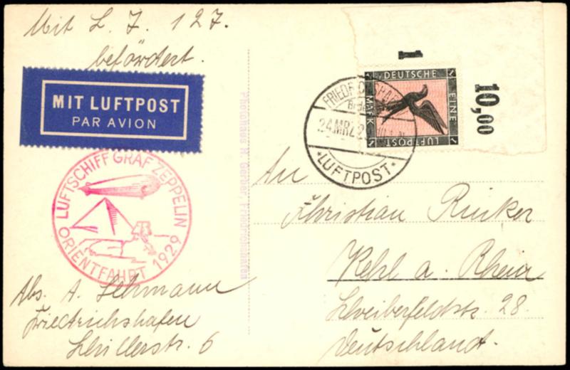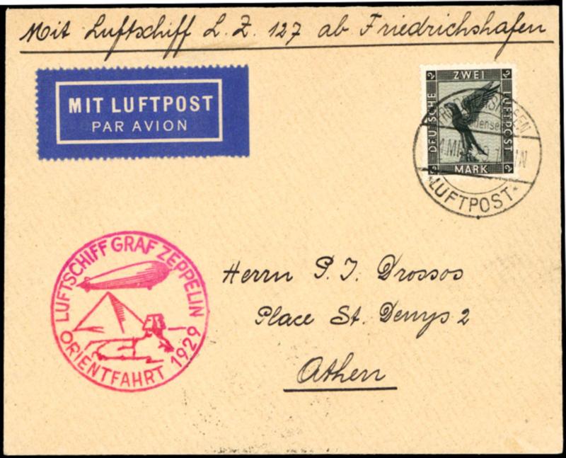 Orient trip 1929, planned, however not realized droped ethene, card from Friedrichshafen 24.3. to ethene with 1 Mark airmail, flight stamp on face, transported to Cairo, regular with ship further, nevertheless is the research to this still open, arrival ethene 30.3, superb (23Ic) Orientfahrt 1929, geplanter, jedoch nicht durchgeführter Abwurf Athen, Karte ab Friedrichshafen 24.3. nach Athen mit 1 Mark Flugpost, Flugstempel vs., befördert bis Cairo, regulär mit Schiff weiter, gleichwohl ist die Forschung hierzu noch nicht abgeschlossen, Ankunft Athen 30.3., Pracht (Image)