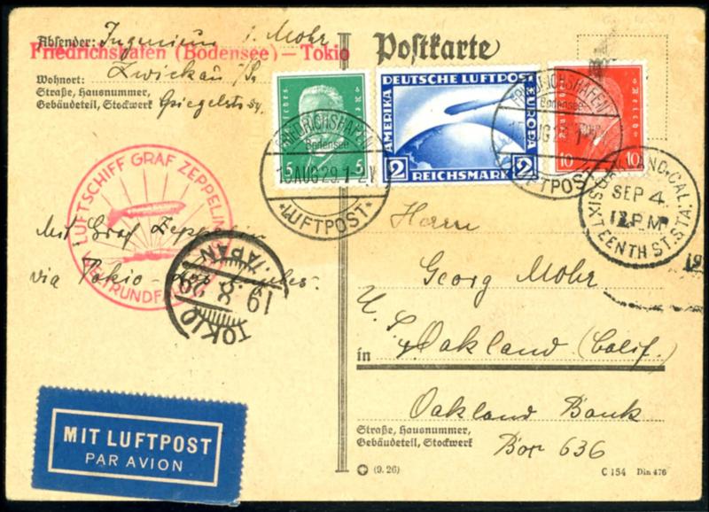 1929, world round flight, military mail with on board cancellation mark from 15.8, postcard with 2 M. Zeppelin as well 5 pfennigs and 10 pfennigs Presidents of the Reich via Tokio (19.8. ) to oakland / USA (arrival postmark 4. September), all postmarks and on face. slight traces of transport. (30e) 1929, Weltrundfahrt, Etappenpost mit Bordpoststempel vom 15.8, Postkarte mit 2 M. Zeppelin sowie 5 Pfennig und 10 Pfennig Reichspräsidenten via Tokio (19.8.) nach Oakland/USA (Ankunftsstempel 4.September), alle Stempel und vorderseitig. Leichte Beförderungsspuren. (Image)