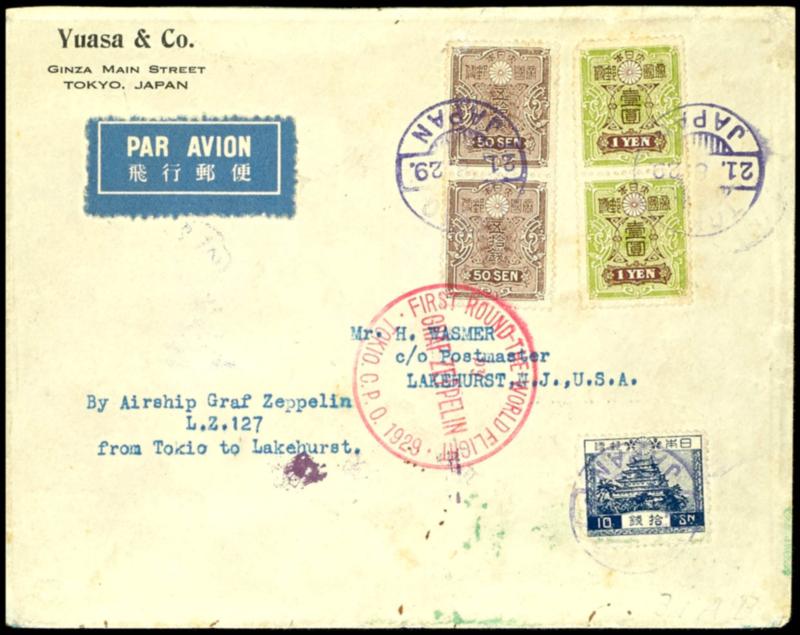 world round flight 1929, Japanese post, letter Tokio USA, reverse special postmark of office or arrival Lot-Angeles and Lakehurst, the letter was accidentally in Lot-Angeles unloaded, after the error the faked stage notes was, return loaded to Lakehurst. Unnoticed slight traces unusual combination (31A,B) Weltrundfahrt 1929, japanische Post, Brief Tokio-USA, rückseitig Sonderankunftsstempel Los Angeles und Lakehurst, der Brief wurde versehentlich in Los Angeles ausgeladen, nachdem der Irrtum der falschen Etappe bemerkt wurde, zurück geladen bis Lakehurst. Ungeachtet leichter Spuren ungewöhnliche Kombination (Image)