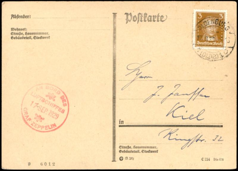 Germany tour 1929, part II, droped Oldenburg, card with 3 Pfg and date stamp Oldenburg 17.9. to Kiel, red on-board confirmation mark 17.9. on face, short text \Herzl. greeting. \ and signature reverse, superb (34k) Deutschlandfahrt 1929, Teil II, Abwurf Oldenburg, Karte mit 3 Pfg und Tagesstempel Oldenburg 17.9. nach Kiel, roter Bordstempel 17.9. vs., kurzer Text \Herzl. Grüße ...\ und Paraphe rs., Pracht (Image)