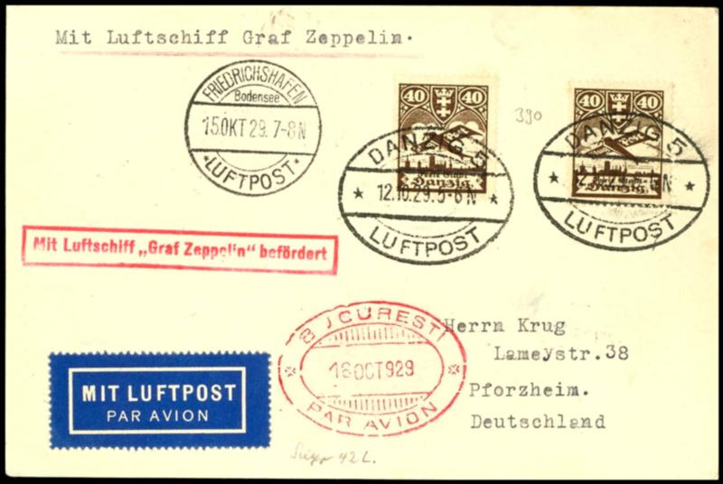 1929, Balkan trip, droped Bucharest, card from Gdansk 12.10.1929 via Friedrichshafen 15.10. to Bucharest 18.10, only 16 cards from Gdansk known (42I) 1929, Balkanfahrt, Abwurf Bukarest, Karte ab Danzig 12.10.1929 via Friedrichshafen 15.10. nach Bukarest 18.10., nur 16 Karten ab Danzig bekannt (Image)