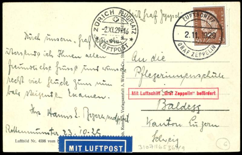 1929, trip to Zurich, board mail from 2.11, card with 50 pfennigs. Presidents of the Reich and on face all postmarks. card little creasely. (45B) 1929, Fahrt nach Zürich, Bordpost vom 2.11., Karte mit 50 Pfennig. Reichspräsidenten und vorderseitig allen Stempeln. Karte gering bügig. (Image)