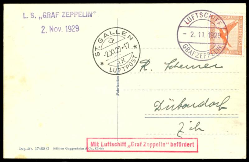 1929, 50. trip of the LZ 127, board mail from 15.11. with arrival postmark St. Gallen, postal stationery postcard with additional franking and on face all postmarks to Nordhausen (Si.50A) 1929, 50. Fahrt des LZ 127, Bordpost vom 15.11. mit Ankunftsstempel St. Gallen, Ganzsachenkarte mit Zufrankatur und vorderseitig allen Stempeln nach Nordhausen (Image)