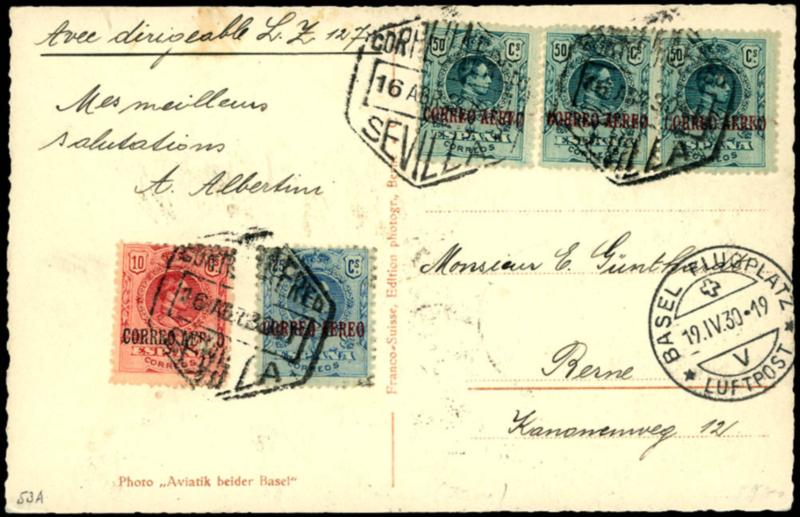 Spain trip 1930, Spanish post, card from Seville 16.4. with notation \Avec dirigible LZ 127 . \, too late arrived, with transit Paris 18.4. and Basle 9.4. to Bern, superb (53A) Spanienfahrt 1930, spanische Post, Karte ab Sevilla 16.4. mit Vermerk \Avec dirigible LZ 127 ...\, zu spät eingetroffen, mit Transit Paris 18.4. und Basel 9.4. nach Bern, Pracht (Image)