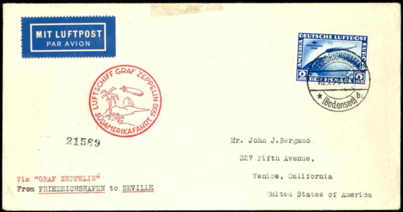 1930, South America flight, handing in for transport Friedrichshafen to Seville, letter with 2 Mark South America flight with plate flaw \moon over airship\ and all postmarks, addressed to California. cover transport traces. Michel the particular stamp already 800.- (57I) 1930, Südamerikafahrt, Auflieferung Friedrichshafen bis Sevilla, Brief mit 2 Mark Südamerikafahrt mit Plattenfehler \Mond über Luftschiff\ und allen Stempeln, adressiert nach Kalifornien. Umschlag Beförderungsspuren. Mi. der losen Marke bereits 800.- (Image)