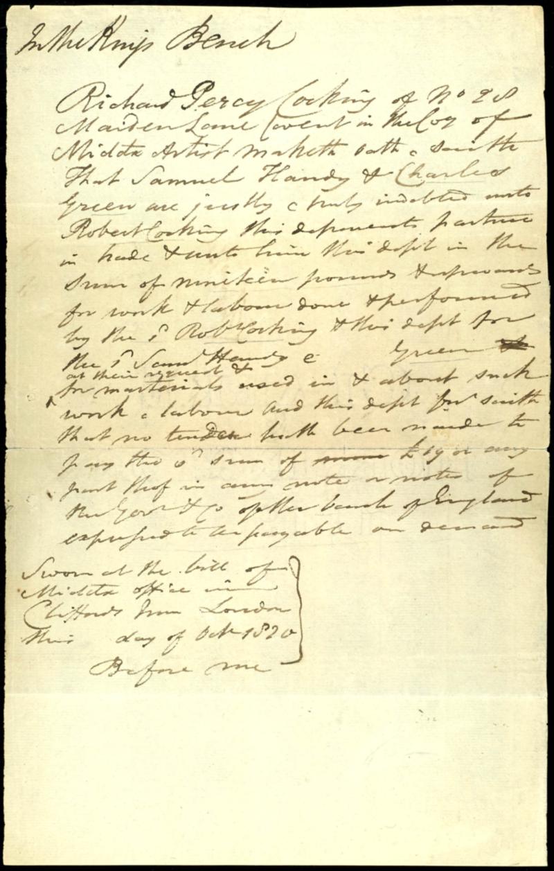 1820, handwritten debenture from CHARLES GREEN at ROBERT COCKING from 1820 over the sum from 19 pound for performed work, reverse a little reinforced, Green was the seeming most important British balloonist of its day, the in his live round 500 balloon trips undertook, beneath 1836 a record Distance trip to Weilburg in Nassau with the balloon \royal Vauxhall\, Robert Cocking was already multiple with parachute jumped off, fell however 1837 by a descent from the from Charles Green steered balloon \Nassau\ in the Death, rare document same of two early, famous balloonist 1820, handgeschriebener Schuldschein von CHARLES GREEN an ROBERT COCKING aus 1820 über die Summe von 19 Pfund für geleistete Arbeiten, rs. etwas gestützt, Green war der wohl bedeutendste britische Ballonfahrer seiner Zeit, der in seinem Leben rund 500 Ballonfahrten unternahm, darunter 1836 eine Rekord-Fernfahrt nach Weilburg in Nassau mit dem Ballon \Royal Vauxhall\, Robert Cocking war bereits mehrfach mit Fallschirmen abgesprungen, stürzte jedoch 1837 bei einen Absprung aus dem von Charles Green gesteuerten Ballon \Nassau\ in den Tod, seltenes Dokument gleich zweier früher, berühmter Ballonfahrer (Image)