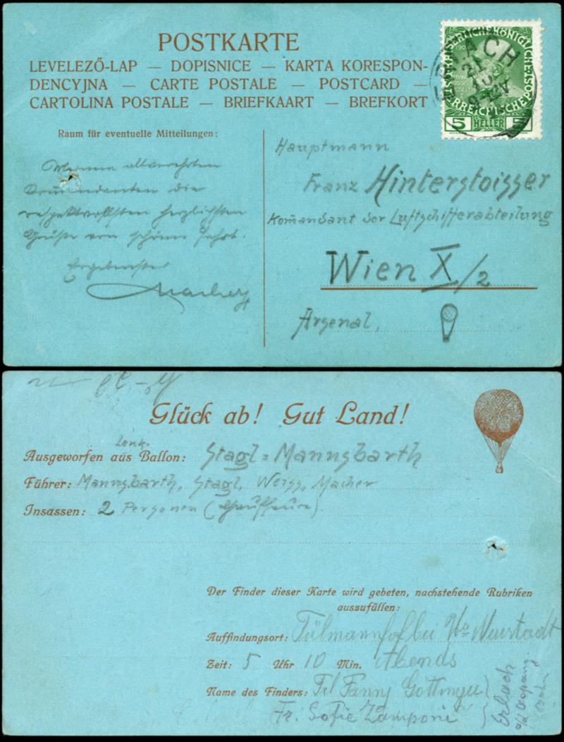 1911, form card \fortune from! good country! \ and \thrown out. \ with manuscript note Lenk balloon \Stagl - Mannsbarth\, Spear hole for the balloon cord, name of the Finders and time handwritten filled, franked with 5 H. from Erlach 21.10. to Vienna postal mailed, much text of the crew member Maker\. kindest greeting from beautiful trip\, extremely rare early airmail from Austria, superb 1911, Vordruckkarte \Glück ab! Gut Land!\ und \Ausgeworfen ...\ mit handschriftlichem Eintrag Lenk-Ballon \Stagl - Mannsbarth\, Spießloch für die Ballonschnur, Name des Finders und Uhrzeit hs. ausgefüllt, frankiert mit 5 H. ab Erlach 21.10. nach Wien postalisch aufgegeben, viel Text des Besatzungsmitglieds Macher \... herzlichste Grüße von schöner Fahrt\, sehr seltene frühe Luftpost aus Österreich, Pracht (Image)