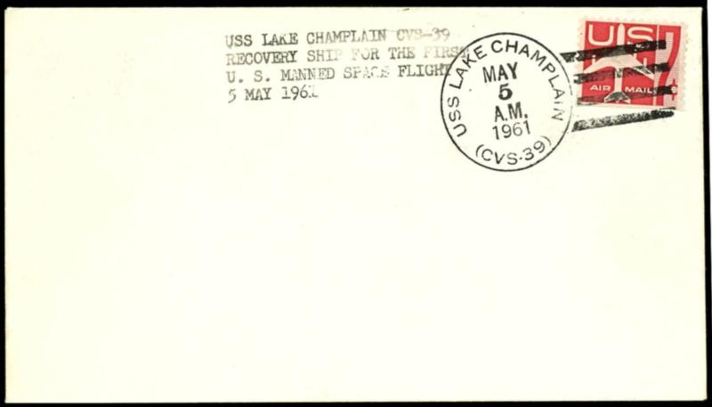 1961, USS Lake Champlain, first in the orbit brought RECOVERY-SHIP document of the first American manned space mission (Mercury Redstone 3), as second manned flight in the history the space travel received! black hand stamp \USS LAKE CHAMPLAIN CVS-39 RECOVERY SHIP FOR THE FIRST U. S. MANNED SPACE FLIGHT 5 MAY 1961\ as well accordingly postmark on unmailed letter, superb 1961, USS Lake Champlain, erster in den Orbit gebrachter RECOVERY-SHIP-Beleg der ersten amerikanisch bemannten Weltraummission (Mercury-Redstone 3), als zweiter bemannter Flug in die Geschichte der Raumfahrt eingegangen! Schwarzer Handstempel \USS LAKE CHAMPLAIN CVS-39 RECOVERY SHIP FOR THE FIRST U. S. MANNED SPACE FLIGHT 5 MAY 1961\ sowie entsprechender Poststempel auf blanko Brief, Pracht (Image)