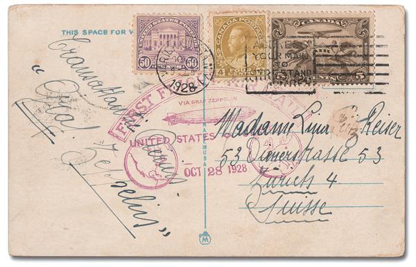 1928 (Oct 29-Nov 1) America Flight, Lakehurst to Friedrichshafen (Michel 8 A), picture postcard franked with a 5¢ Airmail & a 4¢ Admiral plus a U.S. 50¢ #57, the three tied by a New York, Varick St. Sta. slogan cancel, and by the purple flight cachet; to Zurich, Switzerland and backstamped Friedrichshafen on Nov 1, Fine to Very Fine. Michel €2,500 ($2,700). (Image)