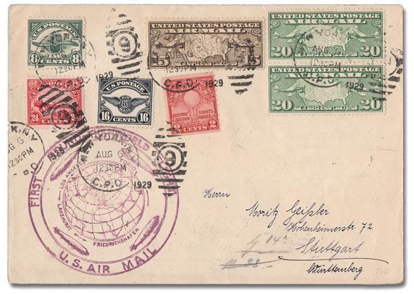 1929 Orient Flight, Friedrichshafen - Er Ramle, America Flight, Lakehurst -Friedrichshafen (Michel 18 I a, 28 a), cover franked with a 2m Zeppelin tied by a Mar 24 Friedrichshafen c.d.s. type I flight cachet plus a private Zeppelin cachet and a Mar 26 Er Ramle backstamp; the cover was then turned inside-out, and franked with $1.05 U.S. postage (including C4-C6 and an 2¢ Edison coil) tied by Aug 6 New York duplex handstamp with the American flight cachet and an Aug 10 Friedrichshafen backstamp., Very Fine and most unusual. (Image)