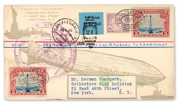 1929, Round-the-World Flight, group of nine covers or cards (Sieger 28 A//29 B), comprising three cards and six covers; comprising Los Angeles to Lakehurst (three cards, three covers; one card franked with six 5¢ coils (#496) including a line pair, one of the covers with Toaspern Zeppelin cachet); Los Angels to Friedrichshafen (two covers signed by Dr. Hugo Eckener), and an oversized Lakehurst to Friedrichshafen cover with a 17-stamp franking (11 different) postmarked Black River Falls, Wis., Aug. 5; an attractive and useful group for the Zepp fan, Fine to Very Fine or better. (PDF for this Lot) (Image)