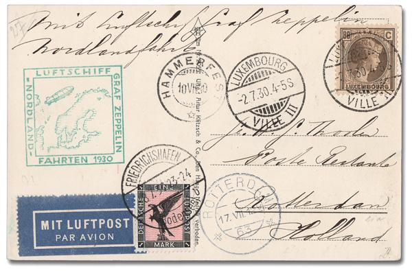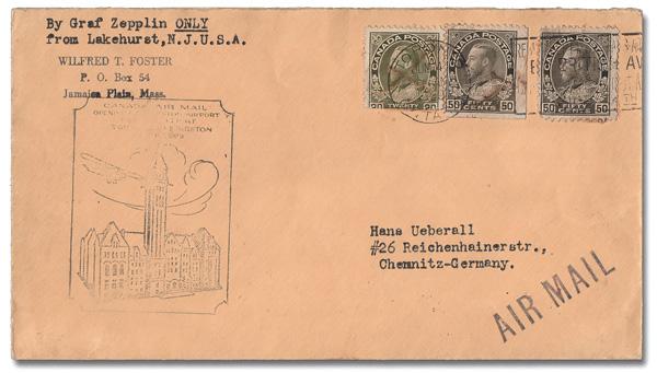 1929 (Aug 7), American Flight, Lakehurst to Friedrichshafen Return (Michel 28 var.), Jun 4 Canadian flight cover, Toronto to Kingston, for the dedication of the Kingston Airport, Jun 4; then carried by rail, Kingston to Montreal (backstamped Jun 6); then by Air to New York/Lakehurst and via Zeppelin to Friedrichshafen (Aug 8 receiver); franked with $1.20 postage tied by a Toronto slogan cancel: 5¢ for Toronto-Kingston, 3¢ Kingston-Montreal, 5¢ Montreal-New York, and $1.05 Lakehurst-Friedrichshafen; total $1.18 - overpaid by 2¢., Fine to Very Fine. Unlisted and, no doubt, unique.(Image)